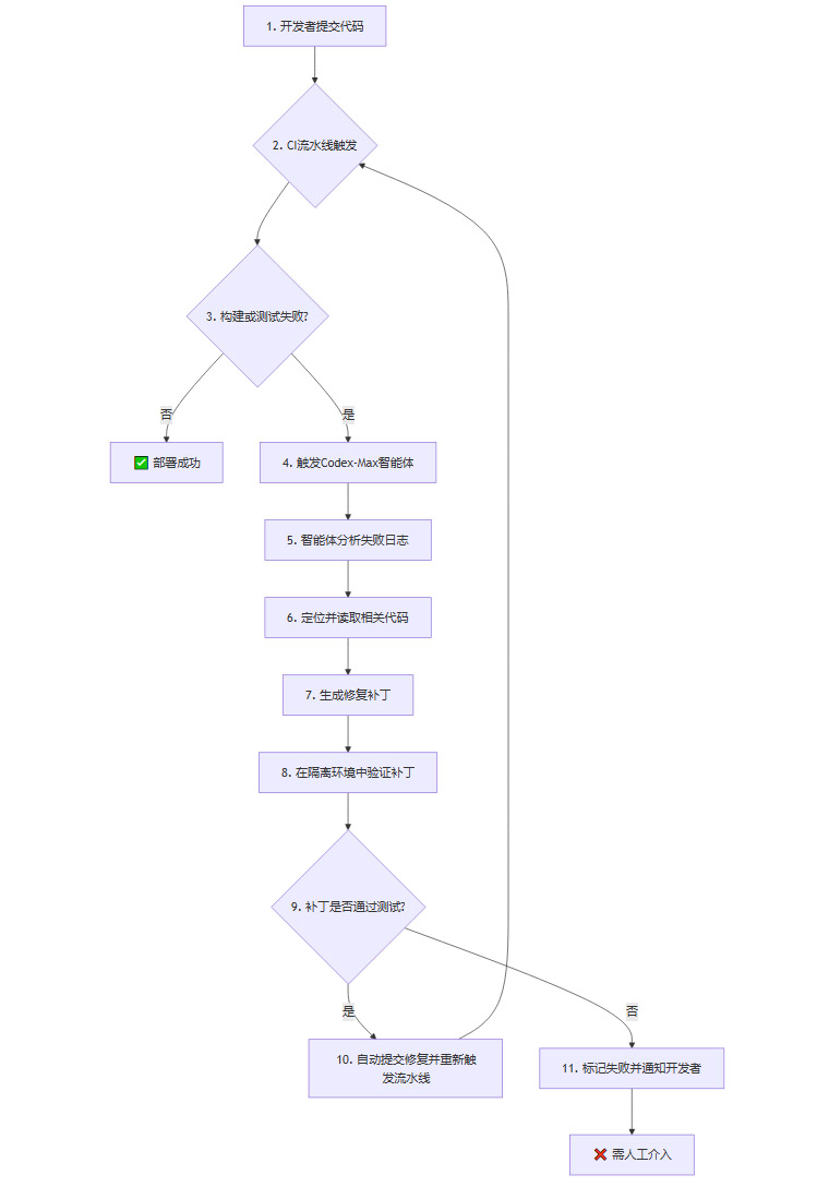CI/CD流水线是现代软件开发的标准实践,但构建失败(Build Failure)是常见的痛点。通常,构建失败会阻塞整个交付流程,需要工程师中断当前工作来紧急修复。GPT-5.1-Codex-Max可以作为CI/CD流程中的一个自主修复节点,实现问题的自动处理。