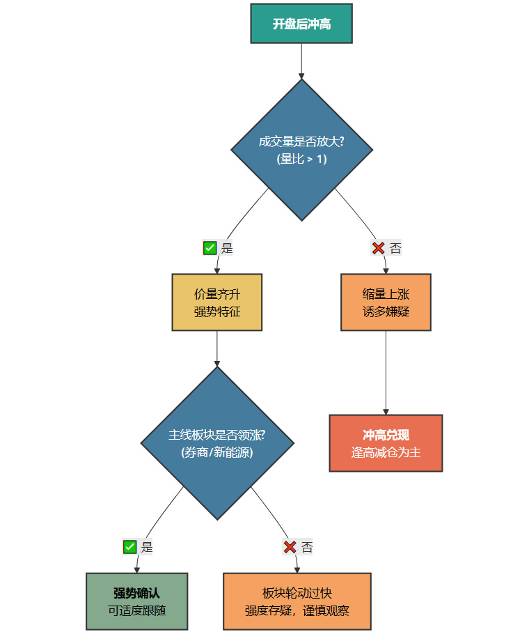 弱势信号:如果市场在冲高过程中,量比始终无法突破1,或者出现明显的“脉冲式”放量后迅速萎缩,则应高度警惕。这表明追高意愿不足,市场大概率将转为冲高兑现的节奏,任何拉升都应被视为减仓的机会。