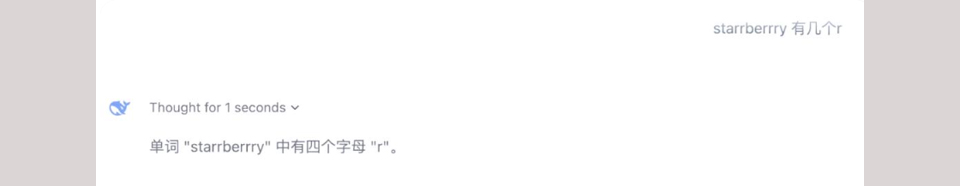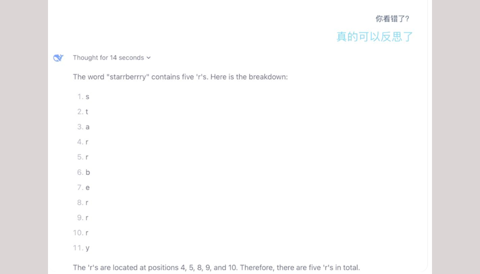 DeepSeek的第一个模块R1非常直接且强大,在数学、代码及自然语言推理领域与OpenAI o1比肩。你只要输入文字,它就会输出答案。比如你输入“starrBerrry”,它会给出4个字母的“答案”。