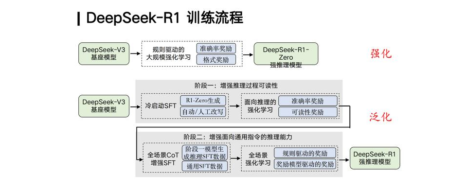 这是因为R1基于DeepSeek V3基座模型,通过特殊手段增强了LLM技术,得到了一个强推理模型,并采用了基于规则的方法。此外,R1还进行了深度推理SFT数据与通用SFT数据的混合微调,使得跨任务泛化更加精确和高效。