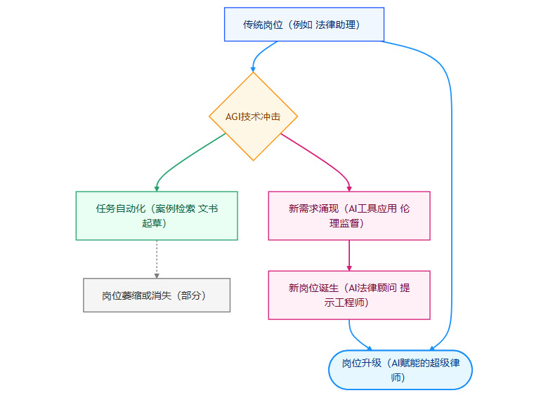 这个流程清晰地展示了,AGI带来的并非单向的毁灭,而是一个解构与重构并存的动态过程。旧的岗位形态被打破,其组成任务被重新分配,一部分被自动化,另一部分则与新的需求结合,最终演化出全新的岗位形态。