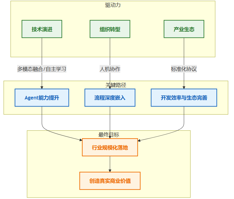 穿越技术、组织、市场这三重“窄门”的过程,无疑是痛苦而漫长的。但只有走过这条窄路,AI Agent才能真正从一个被热议的概念,蜕变为推动社会进步的强大引擎。最终实现商业价值的创造,需要技术、组织和产业生态的协同演进,如下图所示: