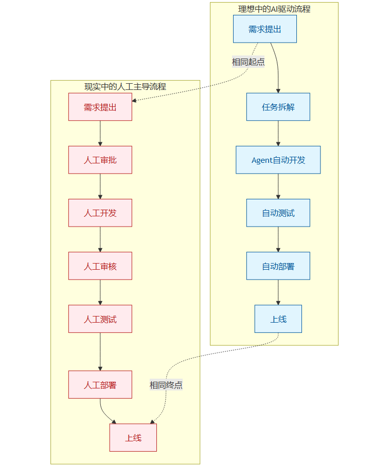在企业的实际运作中,一段代码从诞生到最终上线,需要经历一个漫长且复杂的旅程。理想中,AI Agent应该能实现端到端的自动化,但现实却是另一番景象。这种理想与现实的巨大差距,可以通过下面的流程图清晰地展现出来: