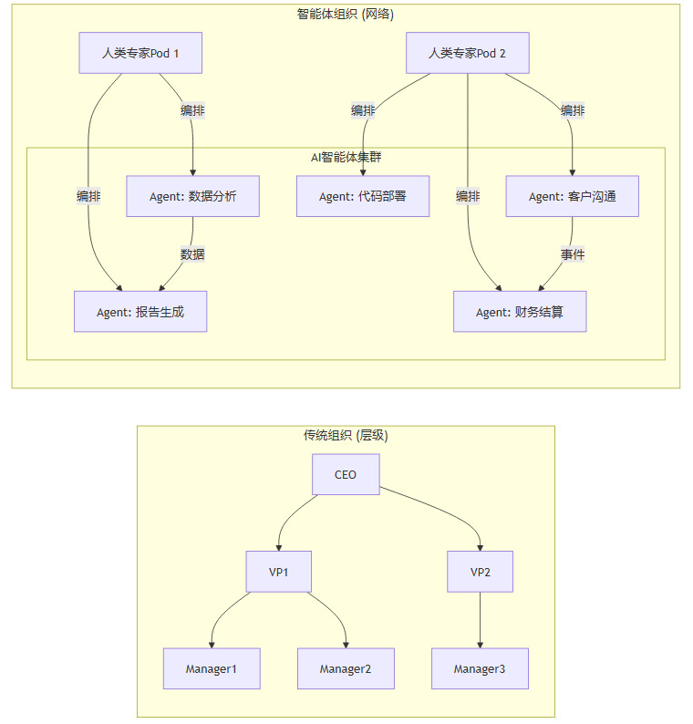 基本单元:不再是岗位或团队,而是“人机混合荚(Pod)”。一个典型的Pod可能由2-5名人类成员和50-100个AI智能体构成。