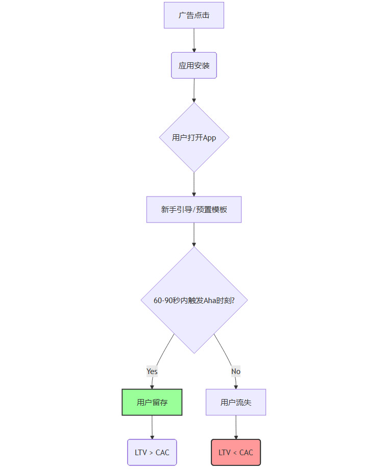 这个流程图清晰地展示了,“Aha时刻”是连接广告投入与商业回报的关键节点。如果这个节点转化率过低,后续的一切都无从谈起。投放预算再高,也只是在购买无效的装机量。