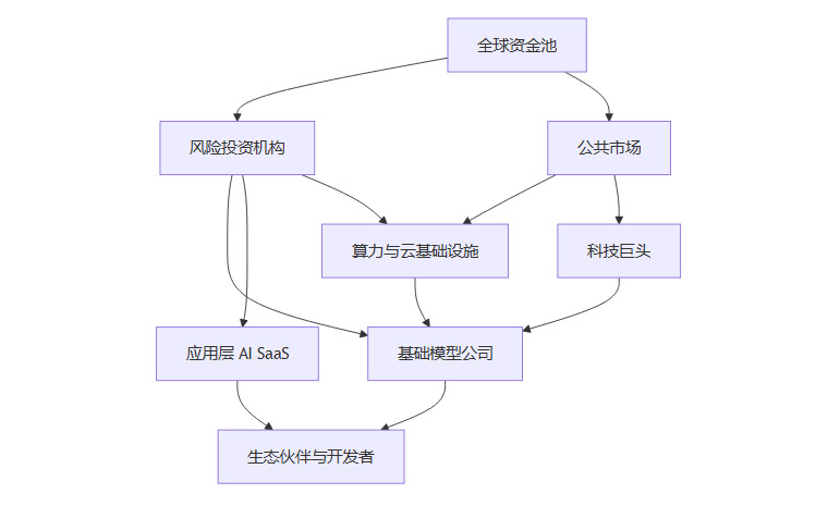 这个图可以读成一条循环路径。全球资金通过风险投资和公开市场进入 AI 相关资产,基础模型、应用层公司和算力基础设施是主要承接方。模型公司和云平台把资源部分分配给生态伙伴与开发者,同时继续反哺头部巨头。每一层都会形成新的估值高地和财富积累点。