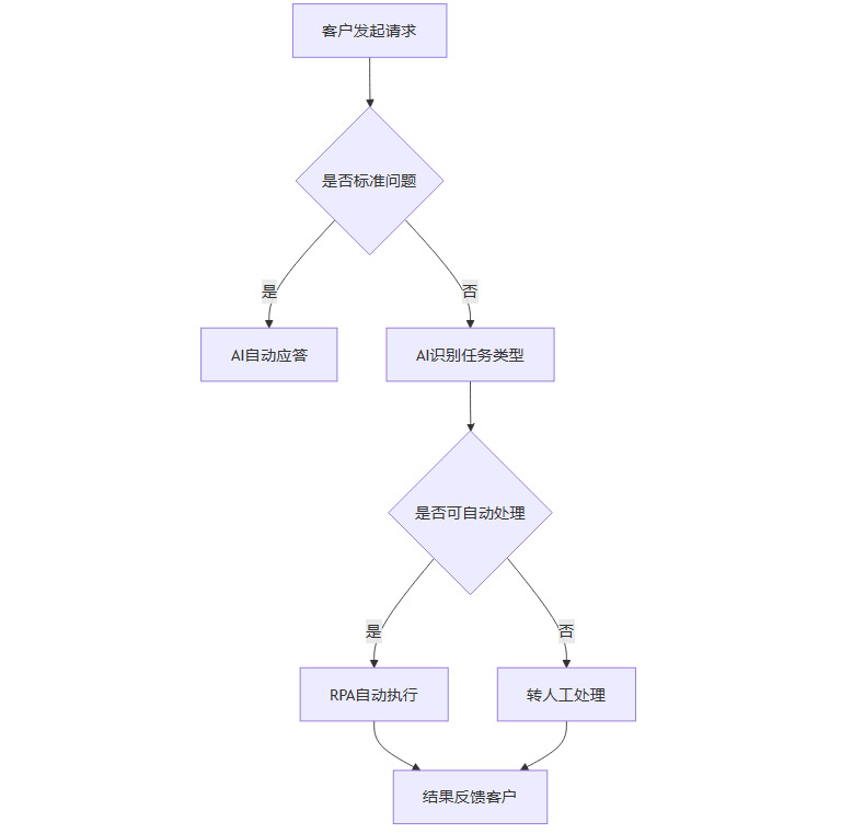 智能客服正从“答疑解惑”向“自动执行任务”演进。通过与RPA等自动化工具集成,客服系统可实现端到端的业务闭环。