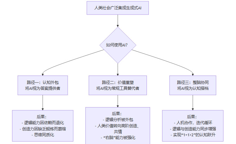 如果我们选择被动依赖,将其视为提供标准答案的“自动售货机”,那么我们的批判性思维和独立思考能力确实面临被侵蚀的风险,无论是左脑还是右脑的功能都会因此变得迟钝。