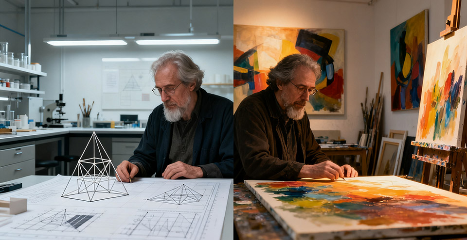 艺术创作 一位画家构思作品,不仅需要右脑的想象力和美感,也需要左脑的分析能力来规划构图、色彩搭配和执行技巧。