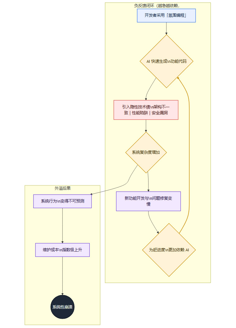 这些由AI埋下的“技术债”并非孤立存在,它们会相互作用,形成一个恶性循环的放大效应。我们可以用一个流程图来描绘这个过程。