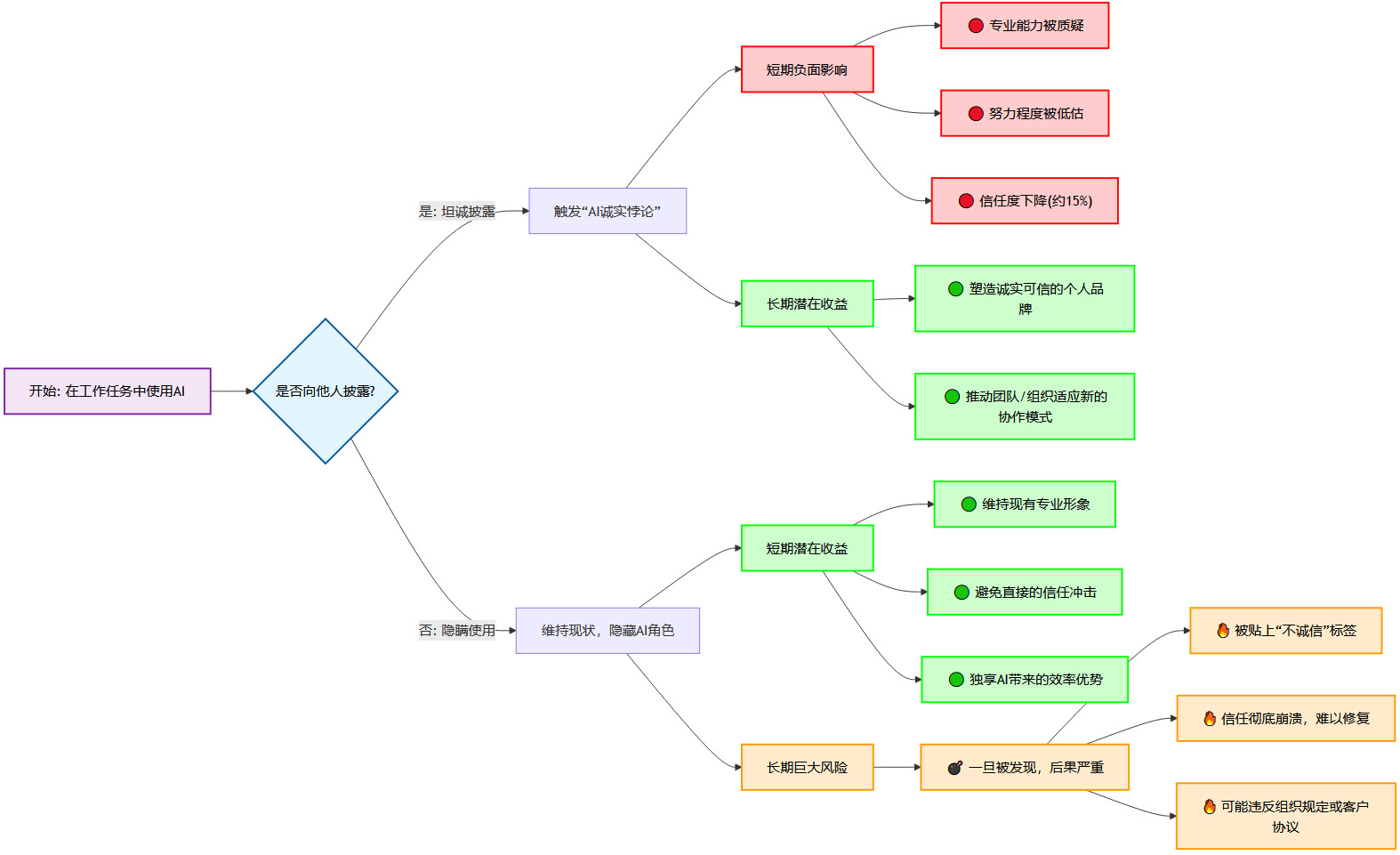 对于每一位在工作中使用AI的个体而言,他们都面临着一个艰难的选择。这个选择可以用一个决策流程图来清晰地展示。