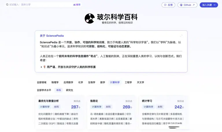 专家层面。项目团队联合了来自中国科学院、深势科技、兰州大学、北京大学等多家顶尖科研机构的专家学者,组建“SciencePedia社区委员会”,对AI生成的核心内容进行持续的专业校验与修订。