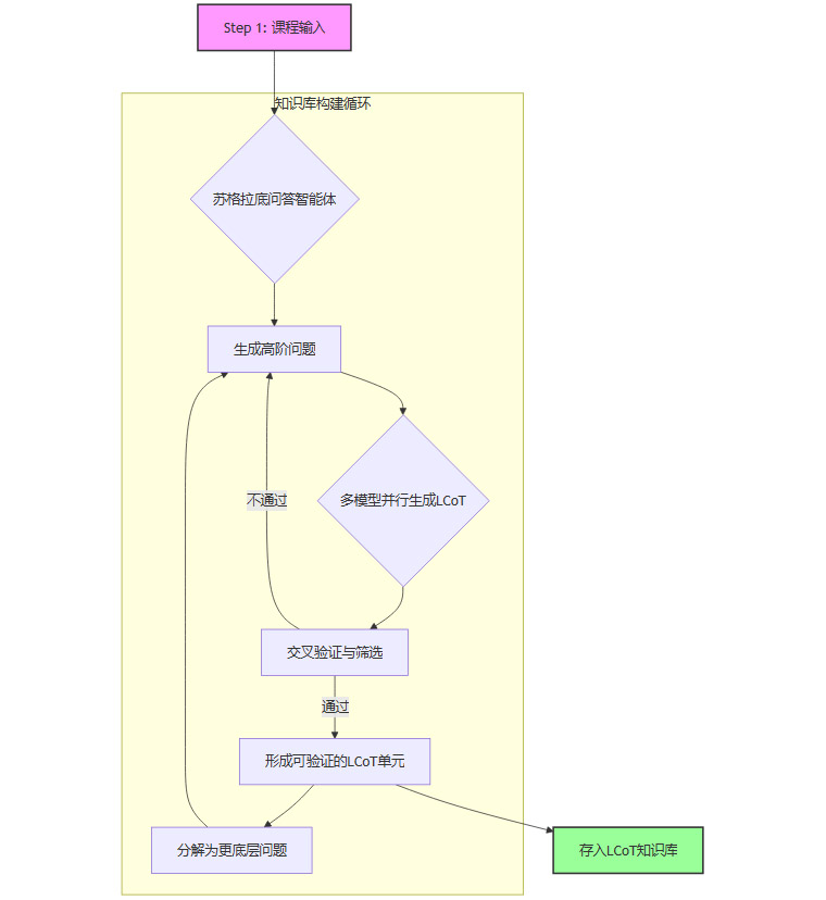 为了系统性地生成LCoT知识库,团队设计了一套自动化流程,其核心是“苏格拉底问答智能体”。这个智能体的工作模式,正如其名,是对知识点进行持续的、刨根问底式的诘问。