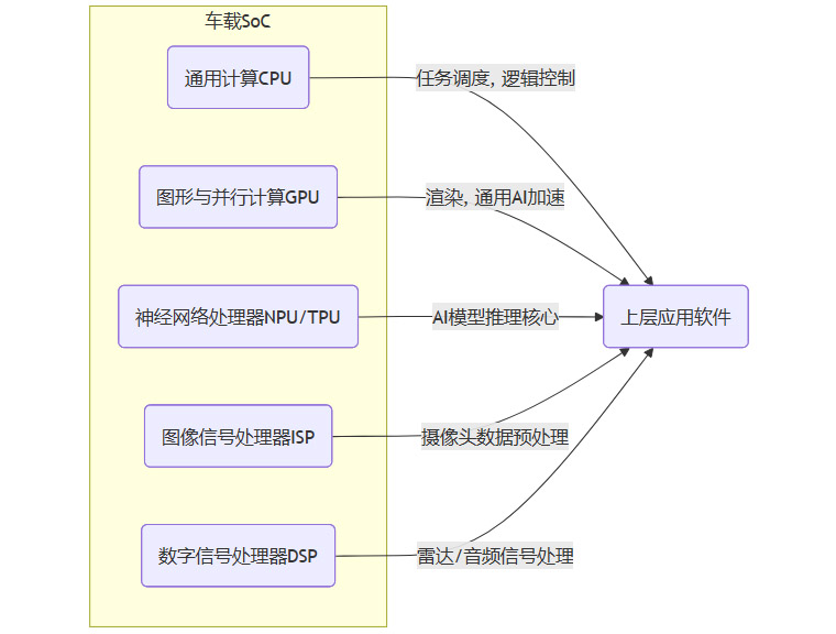 NPU/TPU 作为专用AI加速器,以极高的能效比执行神经网络推理,是自动驾驶计算的核心。