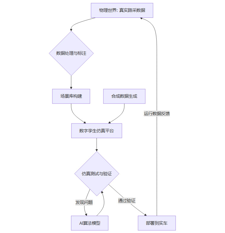面对交通系统的极端复杂性,物理世界的测试既昂贵又危险,且无法穷尽所有场景。数字孪生(Digital Twin)与合成数据技术,构建了一个低成本、高效率的虚拟测试场。