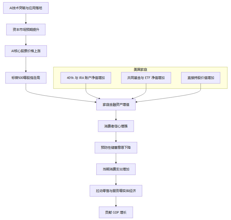 退休金账户(401(k) / IRA):这是美国家庭持有股票资产最主要的渠道。这些账户中的资金大多投资于跟踪标普500等大盘指数的共同基金或ETF。由于AI核心公司在指数中占据巨大权重,指数的上涨直接提升了数千万家庭的退休储蓄净值。