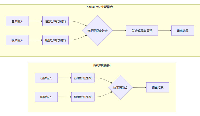 如前所述,Social-MAE采用的“中期融合”策略,是其核心优势之一。我们可以用一个流程图来更清晰地理解它与传统方法的区别。