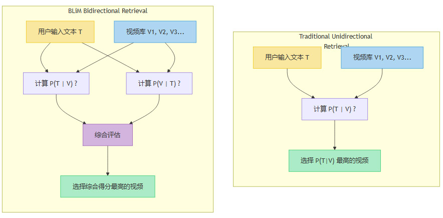 这篇发表于2025年8月、题为《Bidirectional Likelihood Estimation with Multi-Modal Large Language Models for Text-Video Retrieval》的论文(arXiv:2507.23284v2),不仅精准地诊断了病灶,更开出了一剂良方。研究团队提出的BLiM(Bidirectional Likelihood Estimation with Multi-Modal Large Language Models)框架,通过一种巧妙的“双向思考”机制,让AI学会了从两个角度审视问题,从而更准确地判断内容间的真实关联。