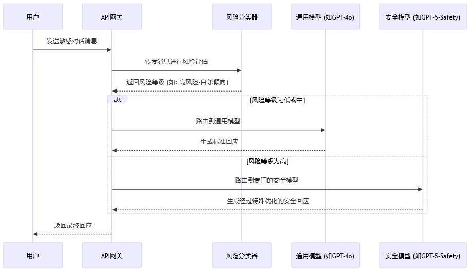 这个流程意味着,当系统检测到用户的对话属于高风险类别(如涉及自杀、严重精神疾病)时,请求会被自动、无缝地切换到一个经过特殊训练、在安全性和合规性上表现更强的模型分支(例如,一个专门的GPT-5-Safety模型)。这个安全模型可能在推理能力或创造性上不如通用模型,但其核心目标是提供最安全、最负责任的回答。