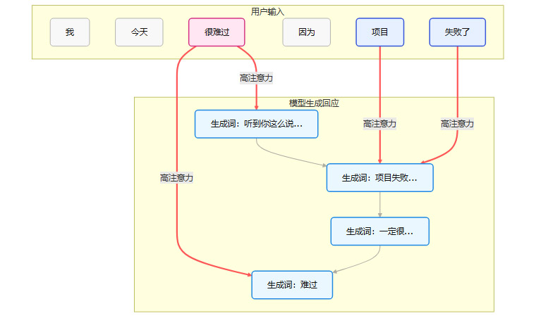 在这个简化的流程中,当模型要生成回应时,注意力机制使其能够高度关注用户输入中的情绪关键词(如“难过”)和事件关键词(如“项目失败”)。因此,模型生成的回答会紧密围绕这些核心信息,让用户感觉自己被“听到”和“理解”了。