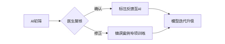 标注反馈与专项训练:医生确认的结果反馈给AI,修正的错误案例用于专项训练。