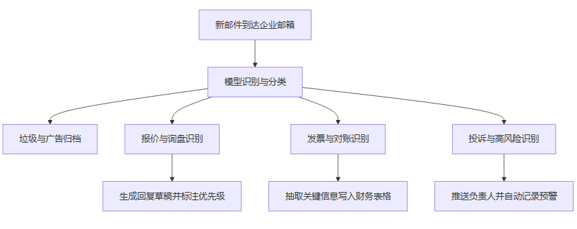 在 Coze 或 AppBuilder 中,可以利用现成插件与企业邮箱和表格系统连接。模型在这个流程中负责理解和分类邮件内容,并根据分类结果生成相应动作,例如生成回复草稿、抽取结构化信息、触发内部提醒等。企业内部人员则在关键节点进行审核和发送。
