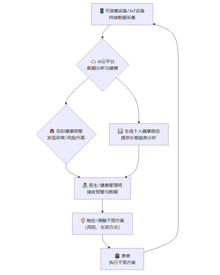 当连续的健康数据与强大的AI分析能力相结合,一个全新的健康管理闭环便得以形成。这个闭环覆盖了从健康监测到康复指导的全过程。