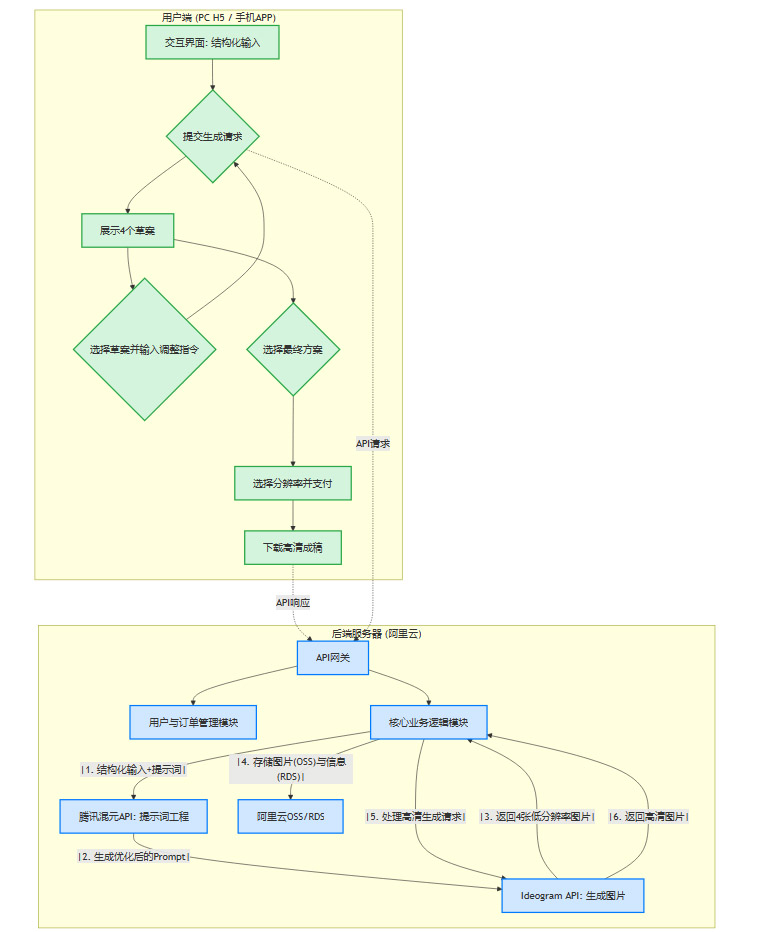 这张图清晰地展示了从用户发起一个创意请求,到最终拿到高清海报的完整闭环。前端负责呈现与交互,后端则扮演着“项目总监”的角色,调度LLM和图像生成API,管理数据,并最终将完美的作品交付给用户。