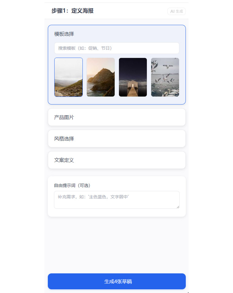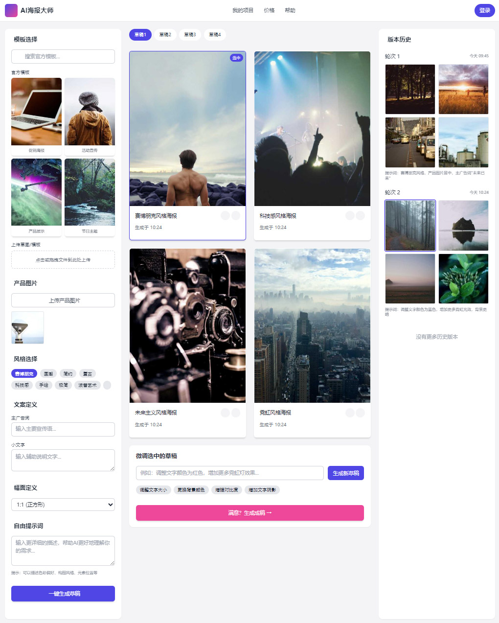 中部展示区 是视觉的焦点,用于展示生成的草稿。采用网格布局,方便用户对比和选择。