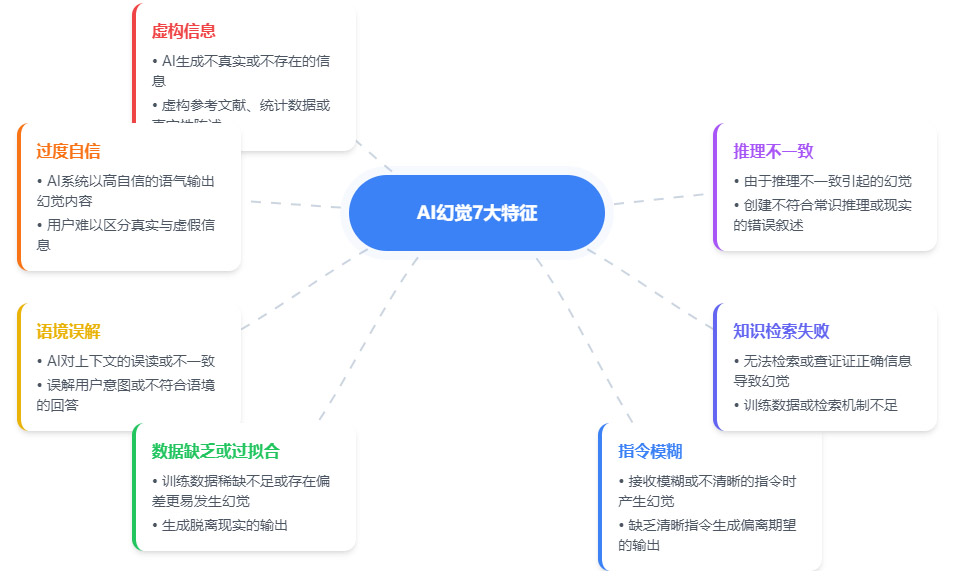 整体来看,这张图帮助我们快速理解AI幻觉的主要类型及其成因,为后续识别和防范AI幻觉提供了结构化的参考。