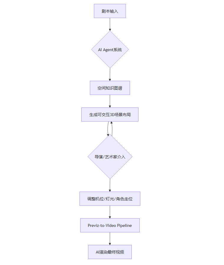 AI Agent系统,则是这套语法的执行者。它可以理解导演输入的抽象创作指令,比如“一个破败的、充满赛博朋克风格的贫民窟”。然后,AI Agent会自动调用空间知识图谱,遵循空间语法,利用PCG生成的资产,快速搭建出一个符合要求的完整3D场景。