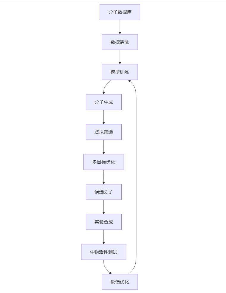 每当AI设计出一个新的分子,系统会立即进行一系列虚拟测试,通过复杂的计算模型评估其在真实环境中的潜在表现。然后,根据评估结果,AI会不断调整和优化其设计策略,这个迭代过程在高性能计算机上可以被极速完成。这个从数据到分子的完整工作流,可以用下面的流程图清晰地展示出来。