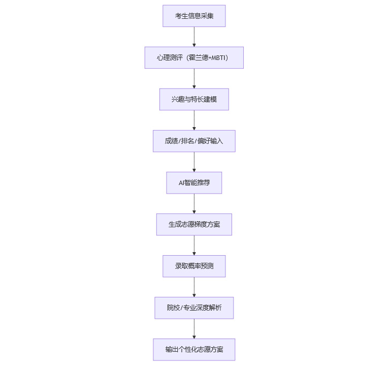 结合考生成绩、排名、地域偏好、院校类型、专业兴趣、性格特质等多维数据。