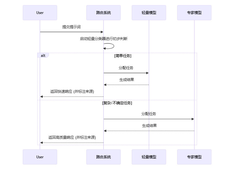 二段式路由:对于“不确定”的复杂任务,可以采用“二段式”路由。第一阶段由轻量分类器判断其大致方向,第二阶段再由一个能力稍强的模型进行更精细的判别,最终决定是否调用最顶级的“专家模型”。