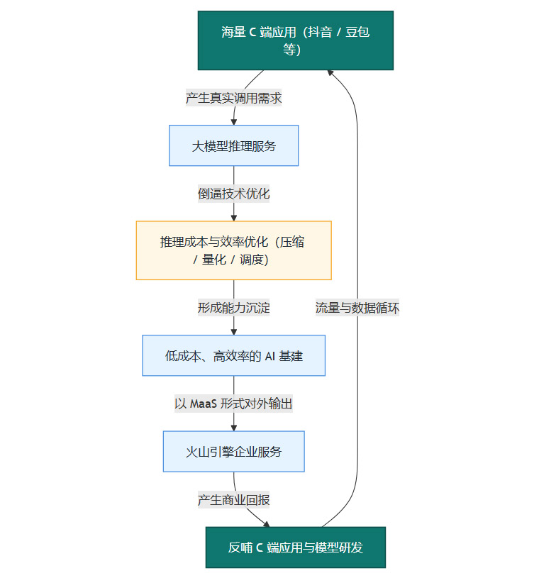 这个模式的核心在于,字节首先用自己的C端业务作为“内循环”,将大模型服务打磨到业界领先的性价比。然后,再将这种经过大规模验证的成熟能力,通过火山引擎开放给企业客户,形成“外循环”。这种模式相比纯粹做B端服务的云厂商,拥有更强的成本控制能力和更贴近真实场景的迭代速度。