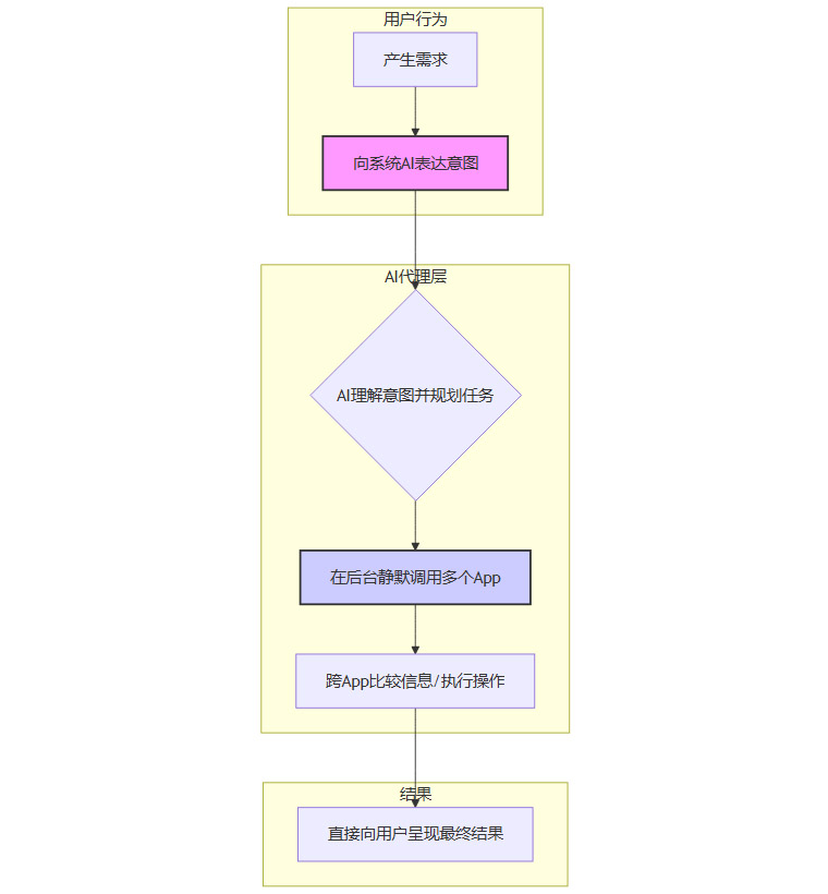 系统级AI代理则试图建立一套全新的逻辑。在这个新逻辑中,App不再是中心,用户的“意图”才是。