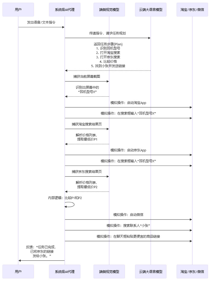 “豆包手机”与以往任何一款手机内置的语音助手都有本质区别。其核心创新在于,将AI从一个被动响应的应用(App),升级为一个主动执行的系统级代理层(System-level AI Agent)。要理解其颠覆性,我们需要深入其技术实现的核心逻辑。