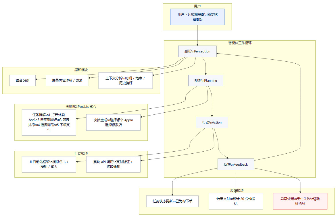 从上表可见,智能体的核心跃迁在于获得了“自主执行”的能力。它不再仅仅是传声筒,而是拥有了“手”和“脚”,能够像一个真实用户一样,在手机的图形界面上进行点击、滑动、输入等一系列操作,从而打通原本相互隔离的应用孤岛。