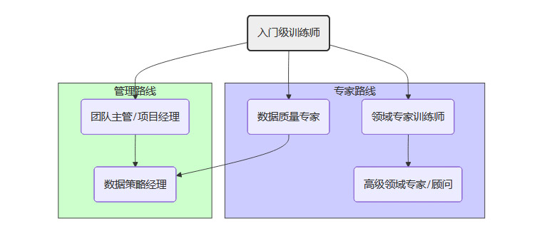 AI数据训练师的职业发展路径是清晰且多元的。从业者可以根据自身的兴趣和优势,选择专精于某一方向,或向更综合的管理岗位发展。