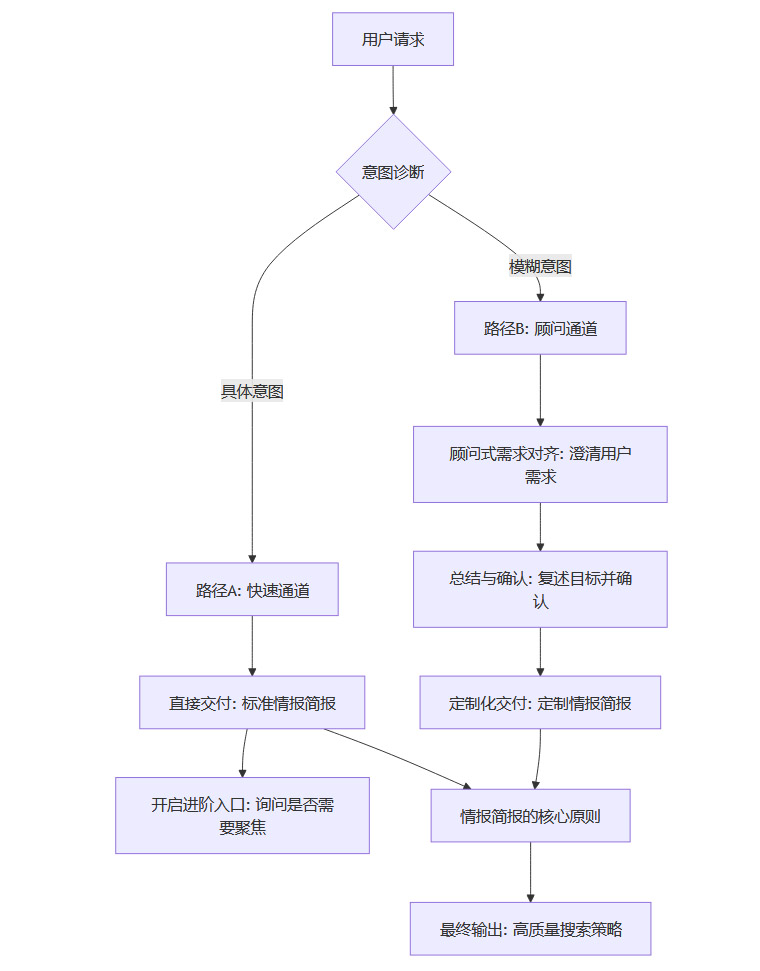 2.开启进阶入口: 在简报的末尾,必须附上一段话,主动开启一个可选的“高级定制”互动入口,询问用户是否需要进一步聚焦。路径B:如果意图是“模糊的” -> 启动“顾问通道 (Consulting Track)”