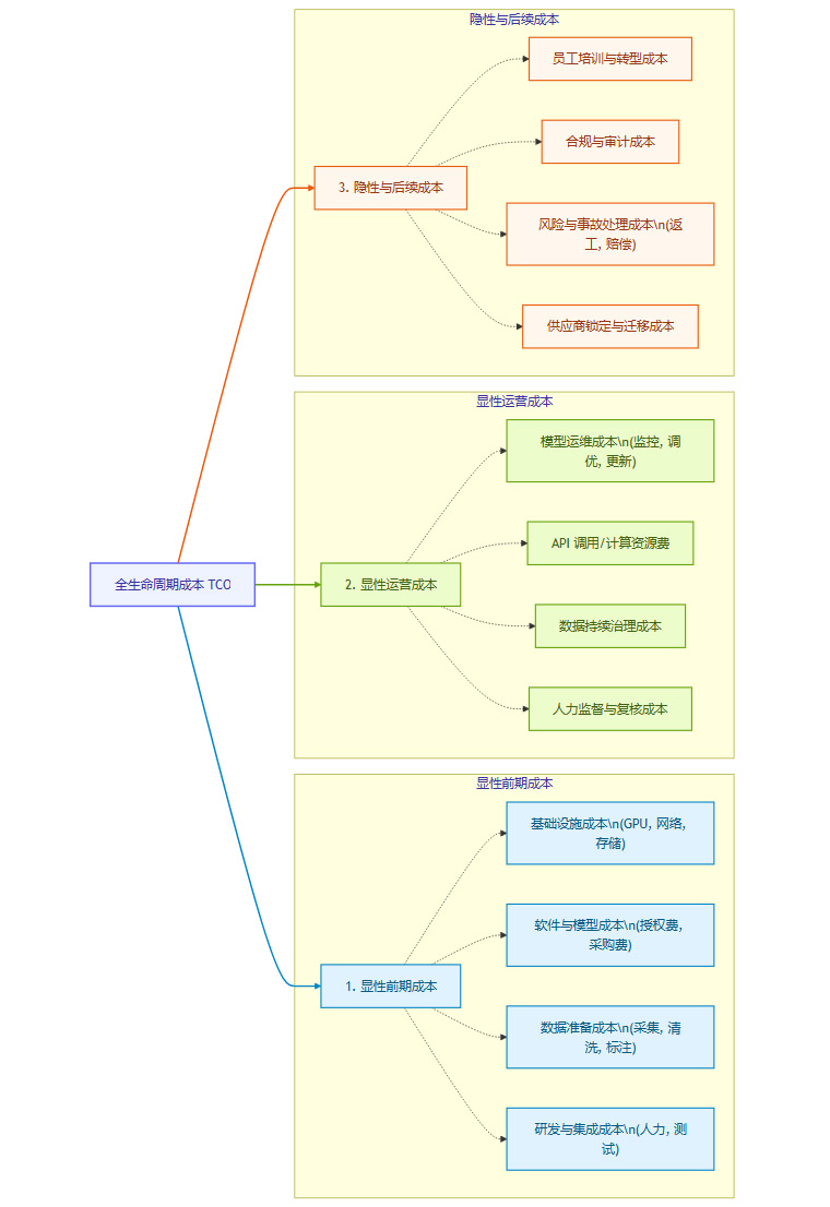 一个完整的AI项目成本核算,必须超越简单的采购和开发成本,覆盖其全生命周期。