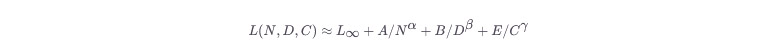 其中,L为损失,N为参数量,D为数据量,C为计算量,L∞为理论下界,A,B,E,α,β,γ为常数。