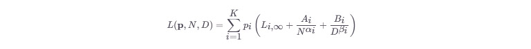 其中,p=(p1,...,pK)为各类数据的混合比例,Li为第i类数据的损失,N为模型参数量,D为数据量,Ai,Bi,αi,βi为拟合参数。