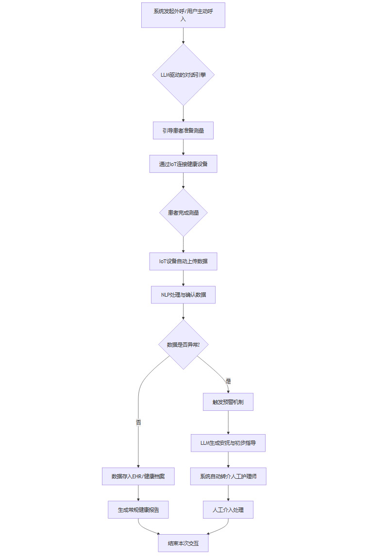 环境感知与联动 未来的IoT应用甚至可以拓展到环境传感器,例如当AI通过对话感知到患者可能出现头晕、摔倒风险时,可以联动家中的摄像头或跌倒传感器进行确认,实现更主动的安防预警。