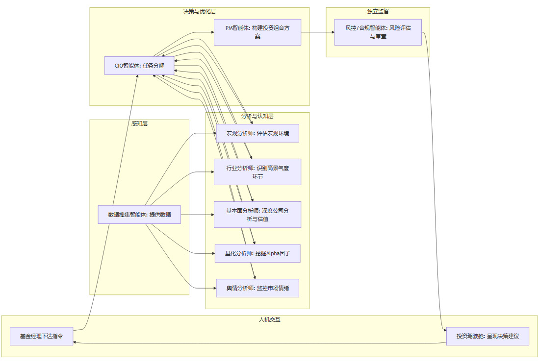 决策呈现 (Investment Cockpit)。最终,一份包含多个备选方案、完整决策证据链和风险评估的报告,以可视化方式呈现给基金经理,等待其最终审批。