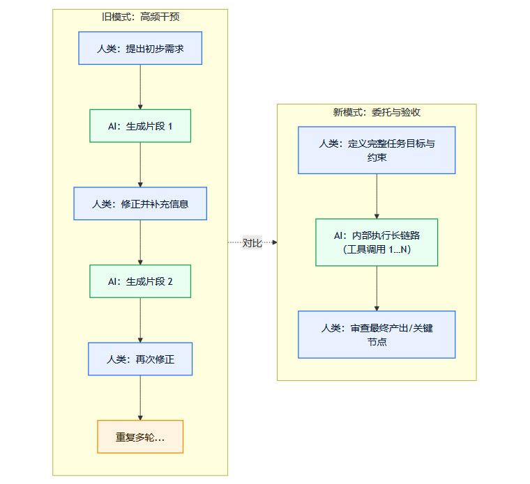 随着工程师对 AI 能力边界的熟悉和信任度提升,人机协作的模式正在从“一问一答”的助手模式,向“委托-执行”的代理模式演进。