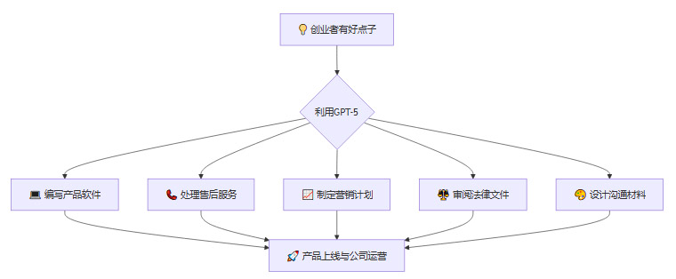 GPT-5的出现,让**个人创业(Solo Entrepreneurship)**从一个小众选择,变成了极具吸引力的现实可能。过去,创办一家公司需要组建一个多元化的团队,分别负责产品、技术、营销、法务、客服等不同职能。这个过程不仅成本高昂,而且管理复杂。