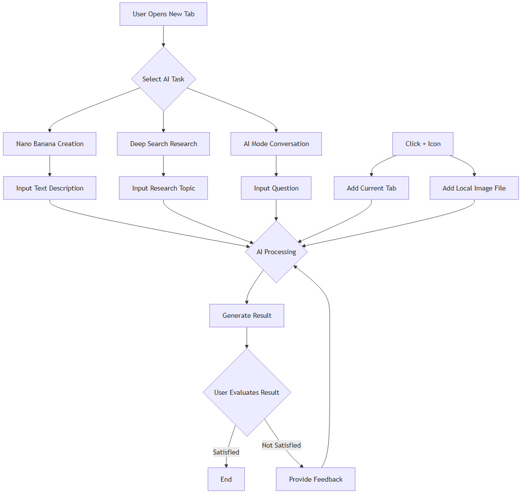 用户不再需要为了使用AI功能而打开特定的网页应用(如ChatGPT或Midjourney)。最高频的AI任务被前置到浏览器的起始点,实现了“开箱即用”的无缝体验。这极大地降低了使用门槛,缩短了从意图产生到任务执行的路径。意图驱动(Intent-Driven)