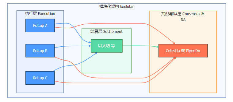 模块化架构的核心,就是解耦。它将单体链的四大功能拆分到不同的层次,由专门的网络来处理。这种分工带来了前所未有的灵活性和可扩展性。