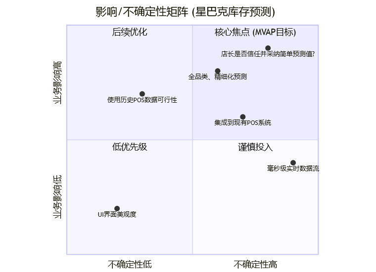 暂不投入(Pause):团队明确决定,继续延迟对“毫秒级实时数据流”、“全品类精细化预测”、“与POS系统深度集成”等复杂功能的投入。因为它们的价值优先级,在当前阶段,远低于建立和巩固用户的信任。